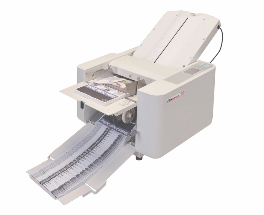The 408A Friction Feed Paper Folder offers advanced features for efficient and precise paper folding. Equipped with an automatic 3-roller friction feed system, it supports 18 preprogrammed folds and 12 custom folds to meet various business needs. The intuitive LED touch screen allows for easy operation, while automatic paper sensing ensures accurate folding every time. With smooth paper ejection and reliable performance, this folder is perfect for offices, print shops, and commercial environments. The 408A paper folder combines versatility, ease of use, and precision, making it the ideal choice for businesses seeking a high-quality, efficient paper folding solution.