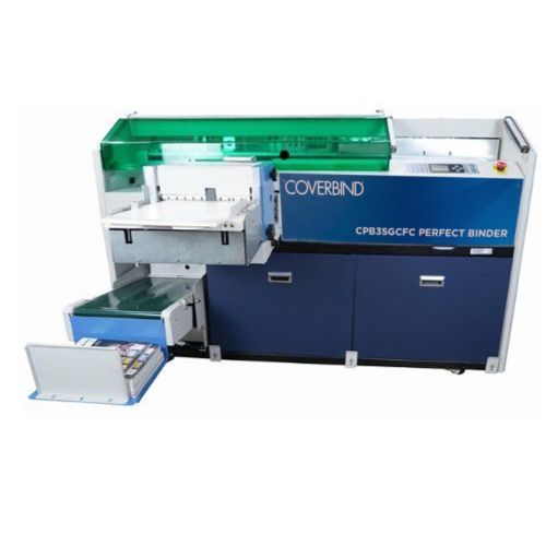 Bookbinding has never been easier with the Coverbind CPB3SGCFC Perfect Binder with Side Gluing, Cover Feeder, and Creaser. Its functional design makes it ideal for medium to large volume binding, and its simple operation is an added bonus. The machine is equipped with an automatic cover feeder with creaser and a vertical stacker to increase productivity. The two separate glue tanks and rollers evenly apply adhesive to the main cover and the spine of the book. Adjust the book’s thickness by simply turning the lever dial to the right to angle the book or to the left to round it. By lifting the cover and adjusting it up and down, the spine position of the book can also be adjusted. The scrapping and milling system on this binding machine ensures that coated, oil-infused, and UV coated materials adhere. It also has a vacuum system that collects dust and other debris after the book spine is cut, keeping your machine and workspace clean. This machine stacks completed books vertically in a loading box for the convenience of the operator.