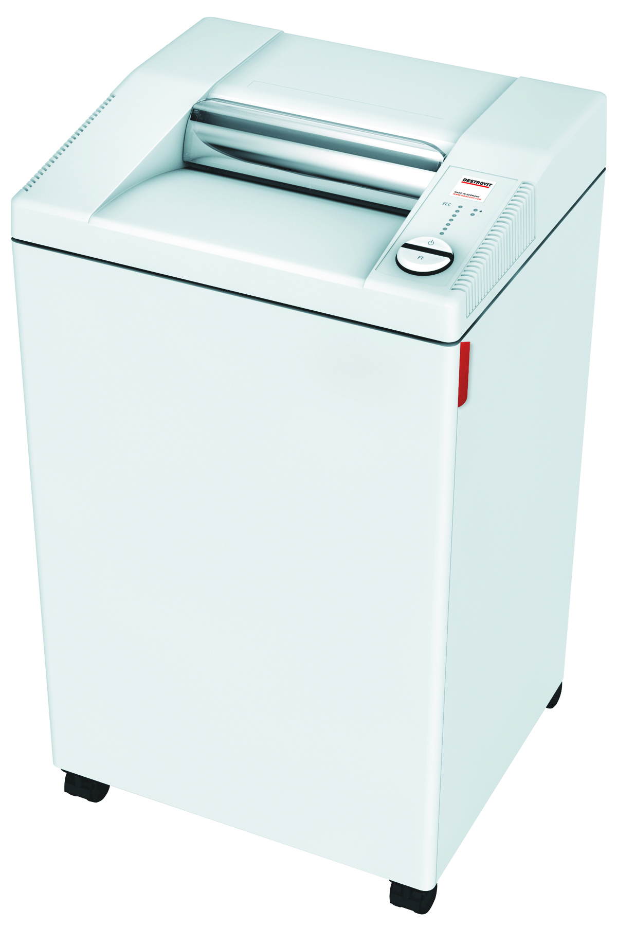 Comprehensive SPS safety package: Easy Switch control element uses illuminated color codes and symbols to indicate operational status and functions as an emergency stop switch; patented, electronically controlled, transparent safety shield in the feed opening; automatic power cut-off when cabinet is opened or shred bin is full; automatic reverse and power cut-off when overfed; double protection against overheating; Zero Energy Consumption sleep mode cuts off power supply after 30 minutes of inactivity. Automatic start and stop controlled by photo cell. Patented Electronic Capacity Control (ECC) indicator prevents jams by monitoring sheet capacity levels during operation. High quality, hardened steel cutting shafts take staples, paper clips, and credit cards (strip-cut and 4 x 40 cross-cut models take CDs / DVDs). Lifetime warranty on the cutting shafts. Quiet and powerful single phase motor rated for continuous operation. Sturdy Twin Drive System with fully enclosed gear box housing. High quality wooden cabinet mounted on casters. Convenient, environmentally friendly shred bin does not require disposable shred bags.