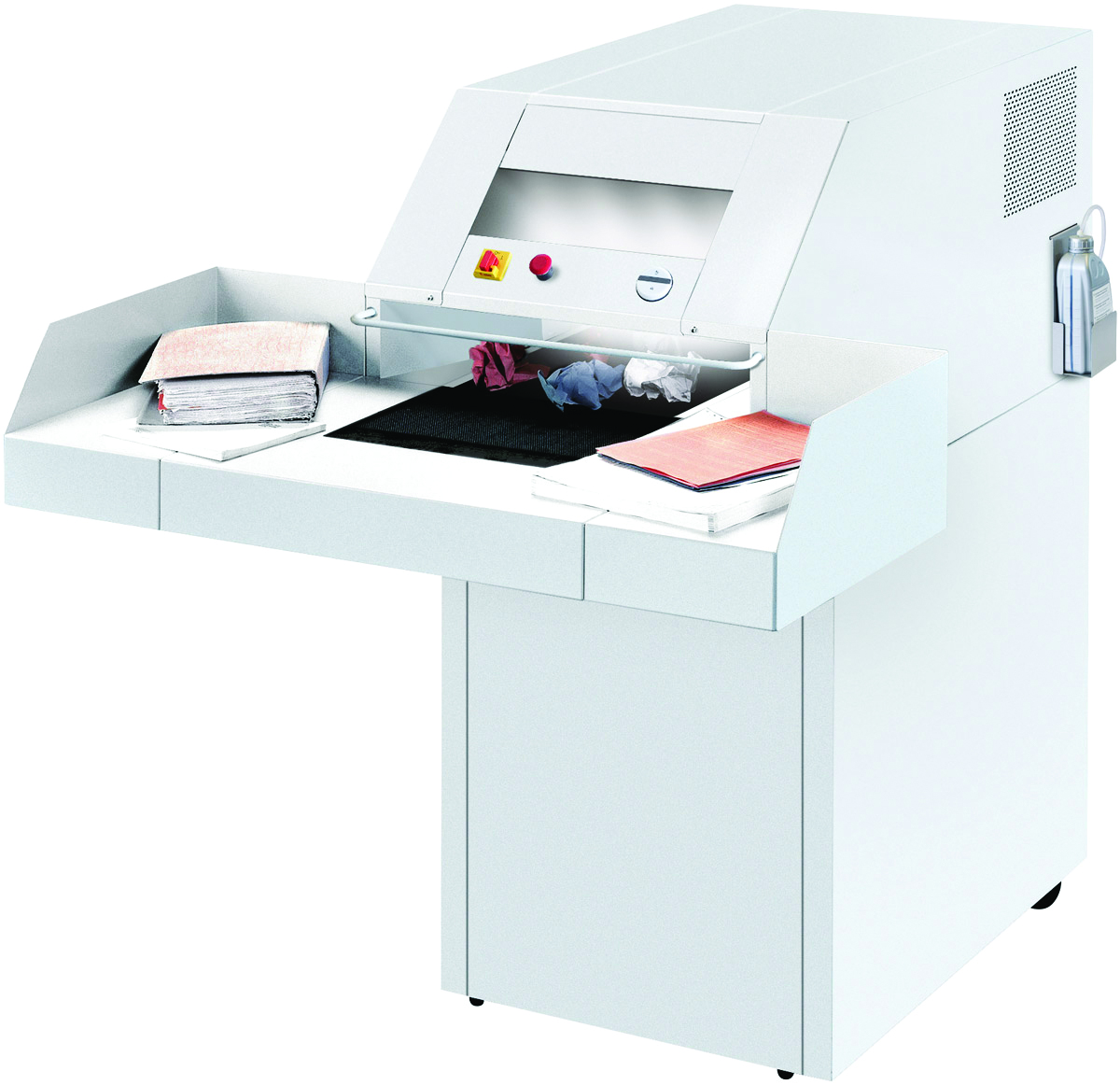 High shred speed for efficient shredding. EASY-SWITCH – intelligent multifunction control element indicating the operational status of the shredder with varying color codes and back-lit symbols. Electronic control prevents overfeeding: automatic reverse and re-feeding in case of paper jams. Main switch and emergency cut-off switch. Robust shredding heads with special hardened cutting shafts made of highquality steel. Automatic oil injection on the cutting shafts during shredding operation for constantly high shred performance. Oil droplet icon will illuminate when more oil is needed. Automatic stand-by after 30 minutes. Powerful three phase motors. Thermal motor protection. Large shred compartment with door on the rear of the machine. Plastic bag suspension with pull-out mechanism on wheels for easy removal of the full bag. High volume bag for the shredded material. Automatic cut-off when shred bag is full or the door is open. Mobile on casters. Convenient transportation width of 27 1/8” (without side tables).