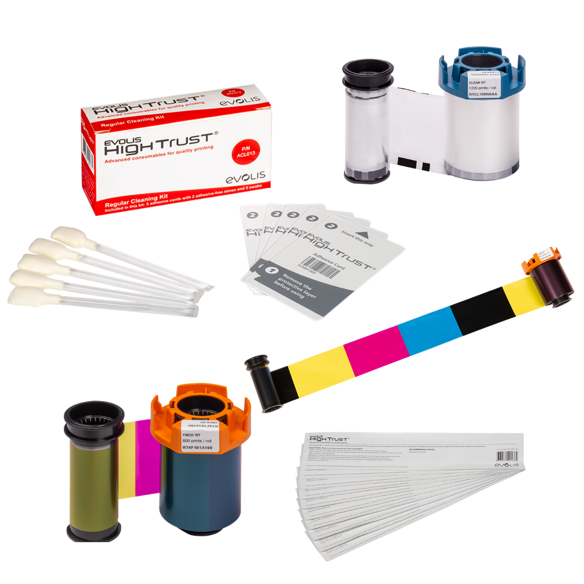 • Evolis ACL010 Advanced Cleaning Kit – 2 ‘T’ Cards, 2 Adhesive Cards, and 2 Swabs
