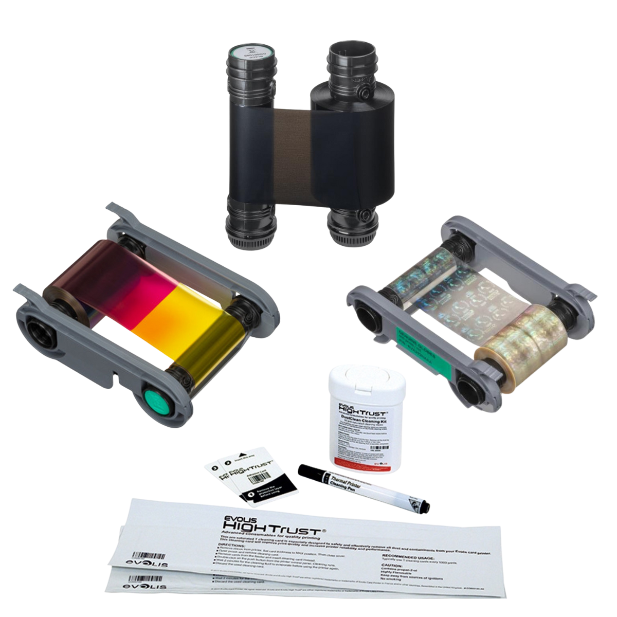 • Evolis ACL002 Advanced Cleaning Kit – 2 ‘T’ cards, 2 adhesive cards, 1 pen, wipes (dispenser)