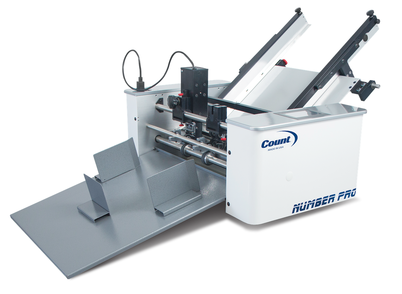 With this easy-to-use numbering machine, simple touchscreen programming lets you number, perf (including micro-perf), or score individually or simultaneously on a range of paper stocks. Number up to 12 times per sheet, virtually anywhere on the sheet. Includes one numbering head. Add a second head for 12 more number locations. The numbering head can crash-number carbonless forms, up to six parts. Uses black or red ink in patented, self-inking, disposable cartridges.
