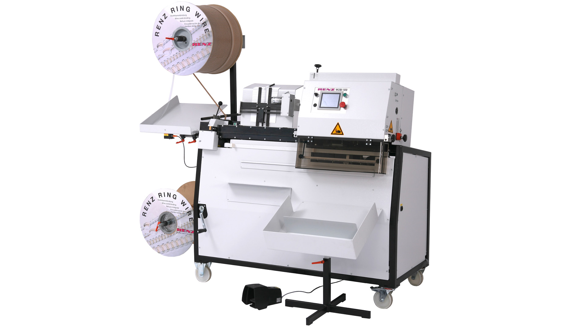 The RENZ MOBI 500 is a powerful, compact and ergonomically designed semi-automatic binding machine for book, calendar and skip binding using RENZ RING WIRE®. It is ideally suited for medium to high production volumes where flexibility, intuitive operation and process reliability are essential. Even demanding or difficult-to-bind products can be processed reliably with this machine. The pre-punched product is inserted horizontally into the wire element, which is automatically fed and cut from the wire spool – a proven method that, assisted by gravity, ensures safe positioning and fatigue-free operation. The binding cycle is triggered via foot switch, initiating automatic transport to the binding unit while simultaneously feeding the next wire element. Once the product is bound, it is delivered into the standard catch tray. For improved material logistics and processing speed, an optional height-adjustable shingling conveyor with adjustable spacing is available. Additionally, the system can be fitted with a calendar hanger dispenser – either the KA 300 for individual hangers or KA 300 R for reel-fed hangers (each suitable for 80–290 mm lengths), making it especially beneficial for seasonal calendar production. The MOBI 500 features a user-friendly touchscreen interface with integrated format and wire diameter adjustment. Changing wire diameters is fast and tool-free thanks to exchangeable guide plates. The machine binds up to 260 sheets and reaches an output of up to 1,000 cycles per hour with setup times of just 5–6 minutes. Thanks to its well-engineered design, the MOBI 500 can be operated without specialised staff and offers long-term investment security due to its robust German construction.
