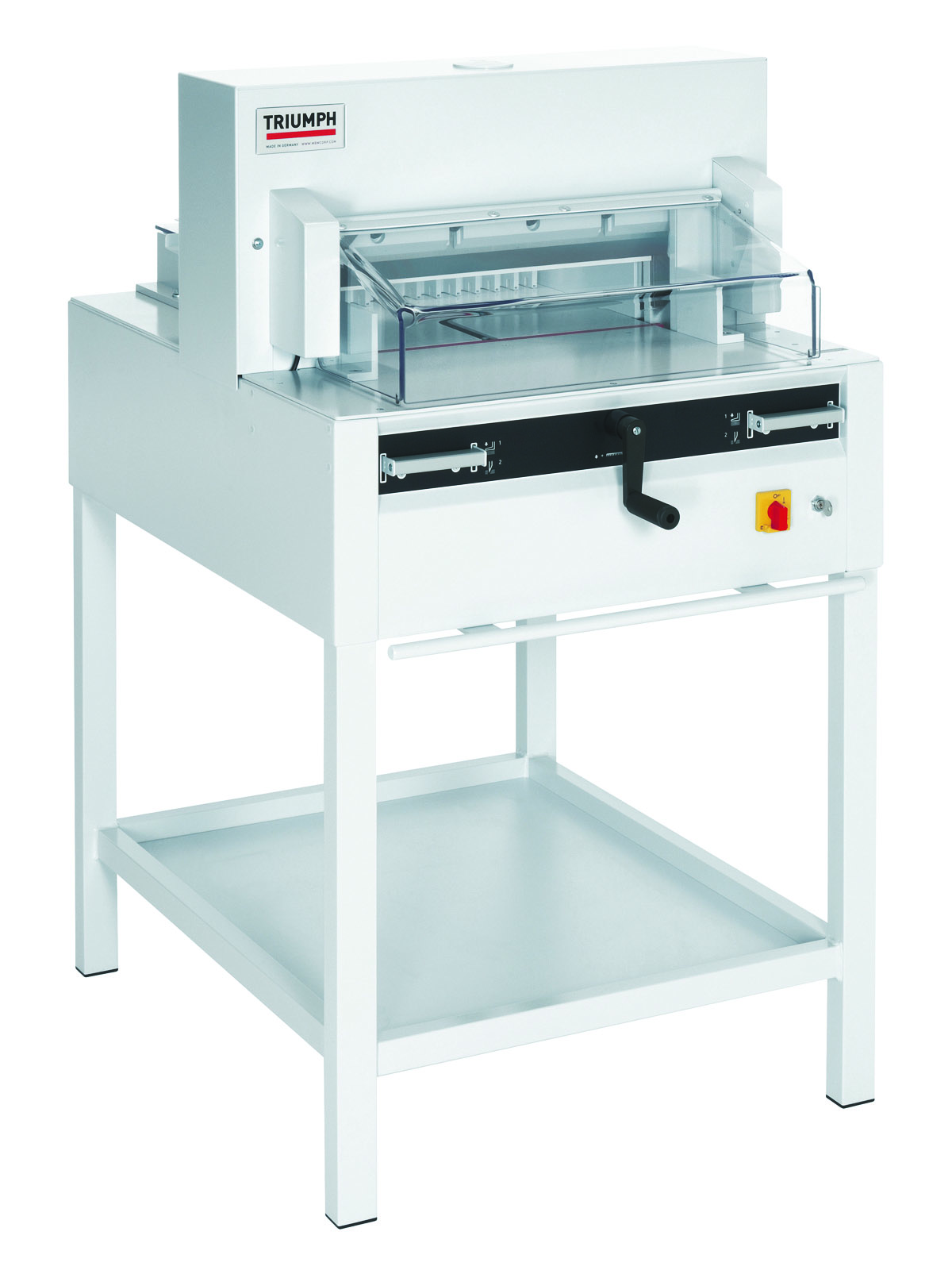 Ergonomic, 37” working height • Electric blade drive • Spindle-guided back gauge with calibrated crank • Front table digital display (cm or inches) for precise back gauge positioning • Bright, LED optical cutting line • Safety cover on rear table • Main switch and safety lock with key • 24 volt controls (low voltage) • Patented IDEAL safety drive • Automatic blade return from every position • Disc brake for instant blade stop