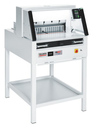 The VRCut Ready Triumph 5260 Paper Cutter is a powerful, programmable electric cutter designed for precision and efficiency. With a cutting width of 20 3/8 inches and a maximum height of 3 inches, it can handle various paper sizes. Key features include an automatic clamp, an electric back gauge, and a digital touchpad for easy programming. The Triumph 5260 paper cutter can store up to 99 programs and supports narrow cuts as small as 1 3/8 inches, making it highly versatile. Designed for ergonomic operation, the paper cutter is equipped with German steel blades, LED optical cutting lines, and a patented safety drive. These features ensure smooth, safe, and accurate cuts, making this paper cutter ideal for high-volume environments.