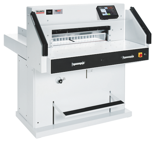 The Triumph 7260 28” programmable paper cutter offers outstanding precision and performance for high-volume cutting. Equipped with a hydraulic clamp and power back gauge, it ensures accurate, efficient cuts for various paper sizes. The intuitive touchpad control module simplifies programming and operation, enhancing productivity. With IR safety light beams on the front table, this cutter prioritizes user safety, preventing accidental injuries during operation. Perfect for offices, print shops, and commercial businesses, the Triumph 7260 paper cutter delivers reliable, consistent results, making it the ideal choice for companies seeking a powerful, safe, and efficient solution for all their paper-cutting needs.